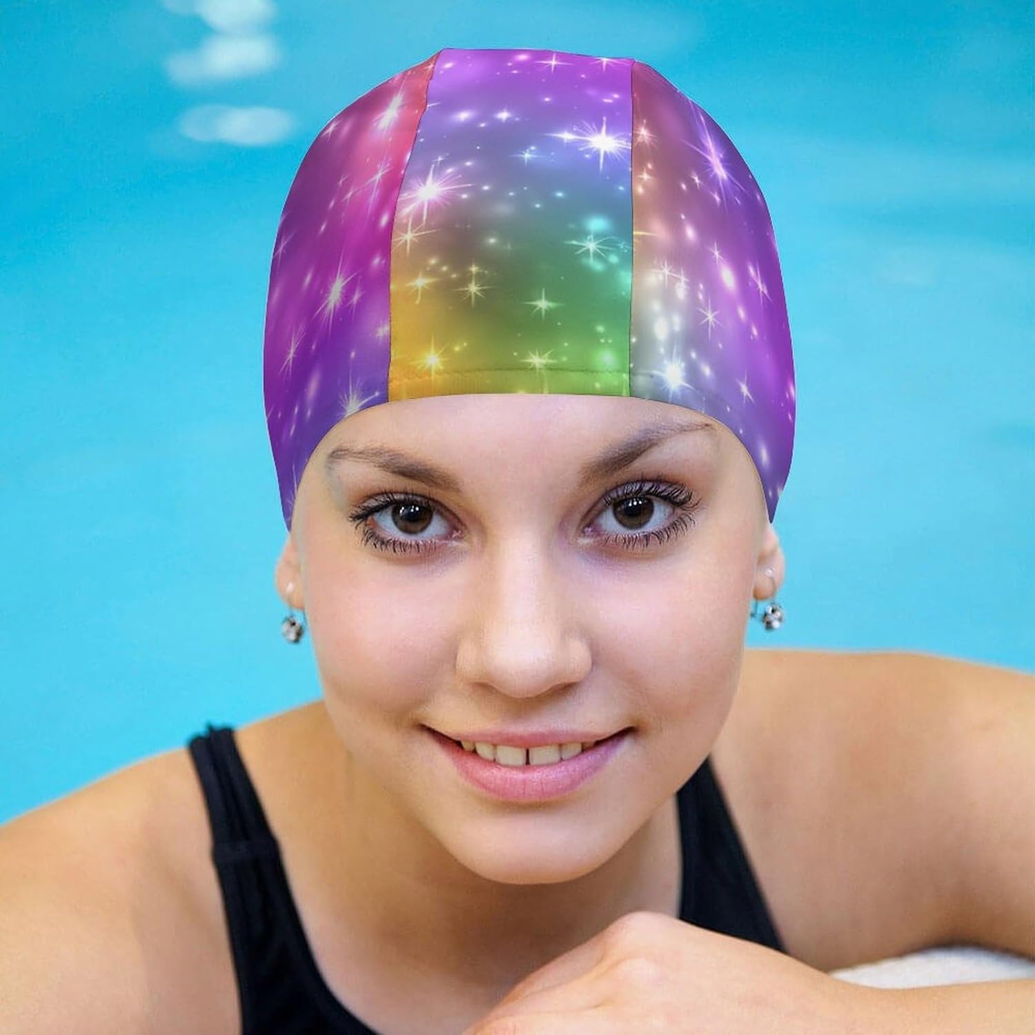 Stay comfortable and protected in the water with this women’s swim cap designed for all hair types, including short, medium, long, and curly hair. Made from stretchable polyester blend material, this swim cap provides a snug yet comfortable fit, ensuring your hair stays dry and shielded from chlorine and pool chemicals. The hydrodynamic design helps reduce drag, making it a great choice for both casual swimmers and competitive athletes