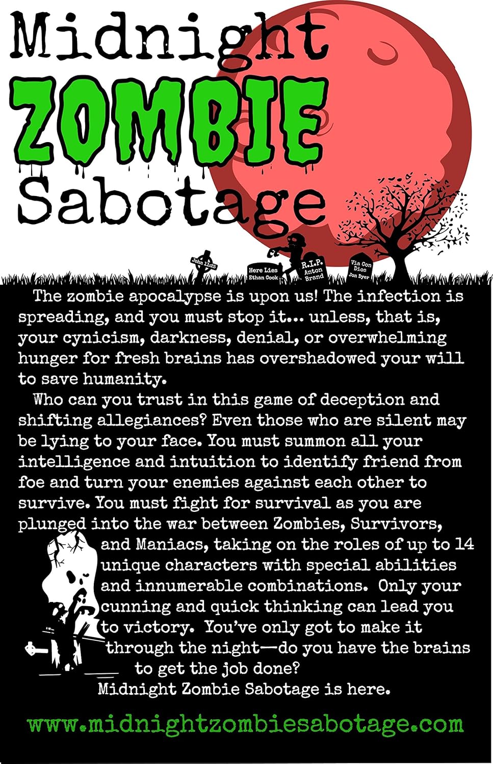 Fight for survival as you are plunged into the war between Zombies, Survivors and Maniacs. Midnight Zombie Sabotage is a hidden identity card game that supports 3 to 16 players, who will take on the roles of 14 unique characters who must use their character specific abilities, deductive reasoning and critical thinking skills to identify the enemy and convince the rest of your party to eliminate the threat while avoiding becoming a target yourself. Players will have hilarious fun while being challenged by the various scenarios they find themselves in, including; being out numbered, not being able to speak at times, being converted to the opposing team, having your role reversed by the Maniac’s influence, or not blowing your cover while behind enemy lines and so on. Survival of the Smartest.